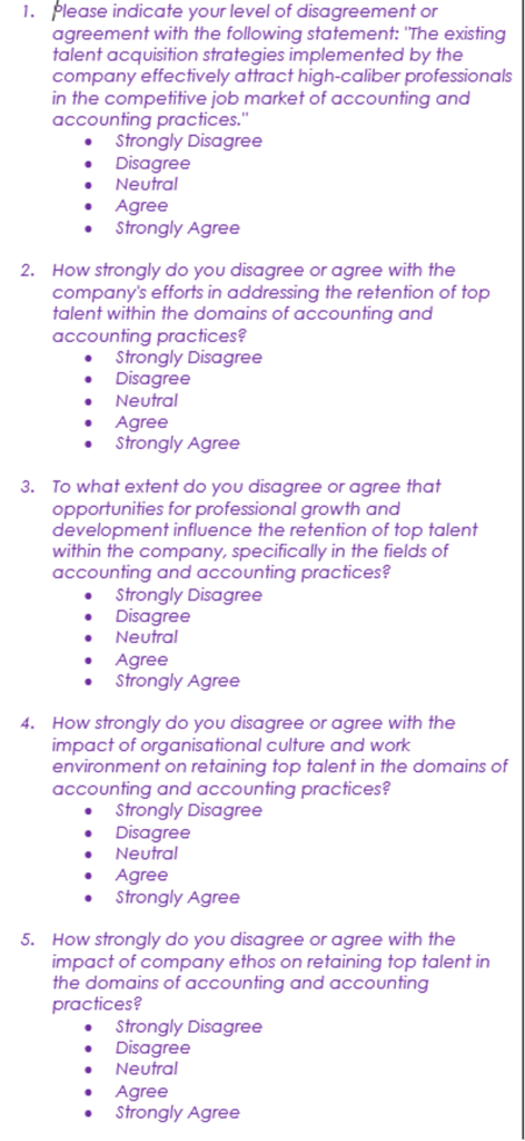 The aim of this study was to assess and improve the company’s talent acquisition strategies to attract and retain top talent in the accounting practice by 19%. According to the findings of the study, the most effective strategies for attracting and retaining talent are competitive compensation and benefits, structured recruitment and onboarding processes, investment in employer branding, professional development opportunities, and offering flexible work arrangements. These findings align with the literature review on talent acquisition and retention in professional services especially in accounting field.