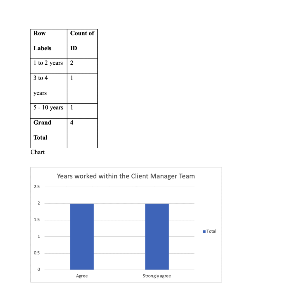 The results show that the respondents have varying lengths of experience in the Client Manager Team: One with 5–10 years, One with 3–4 years, Two with 1–2 years. This diversity in the number of years worked allows for a range of perspectives from both newer and more seasoned staff.