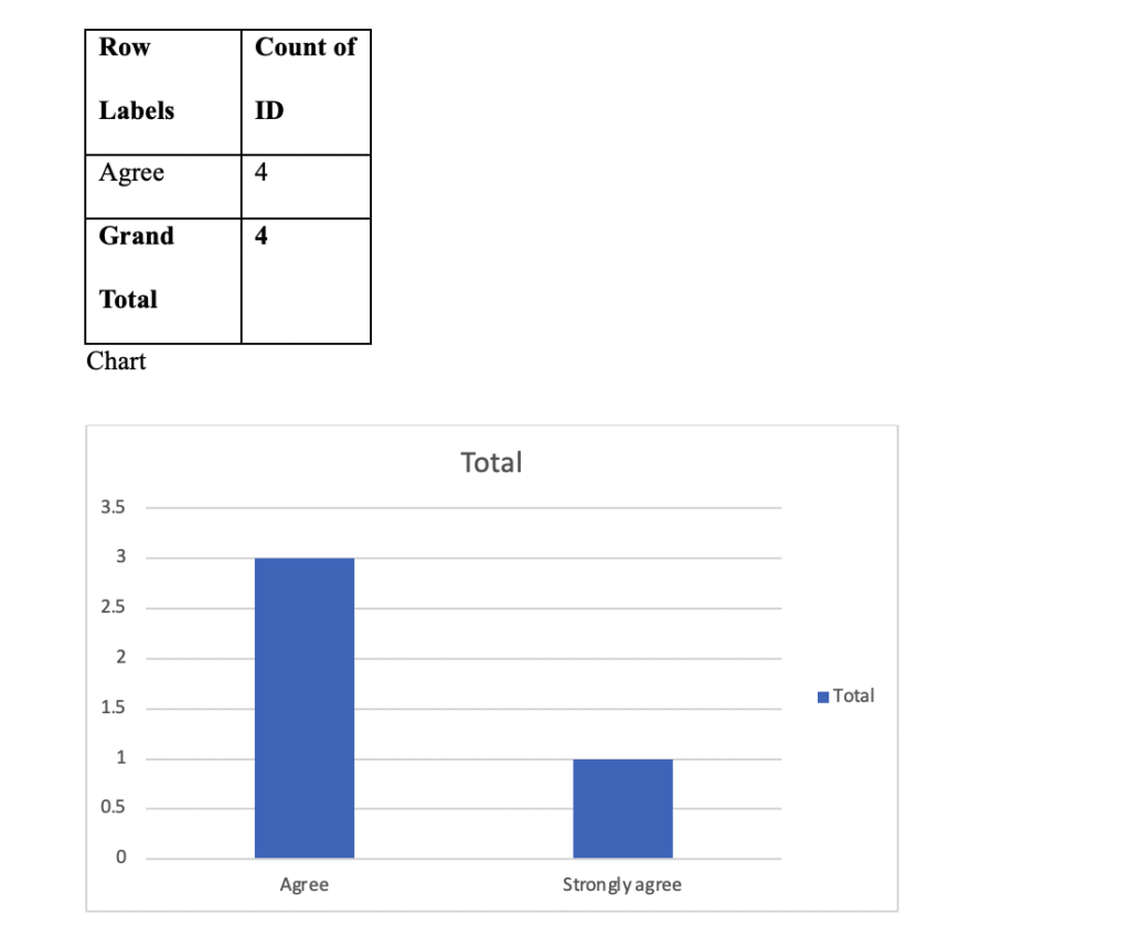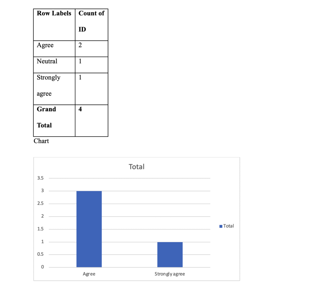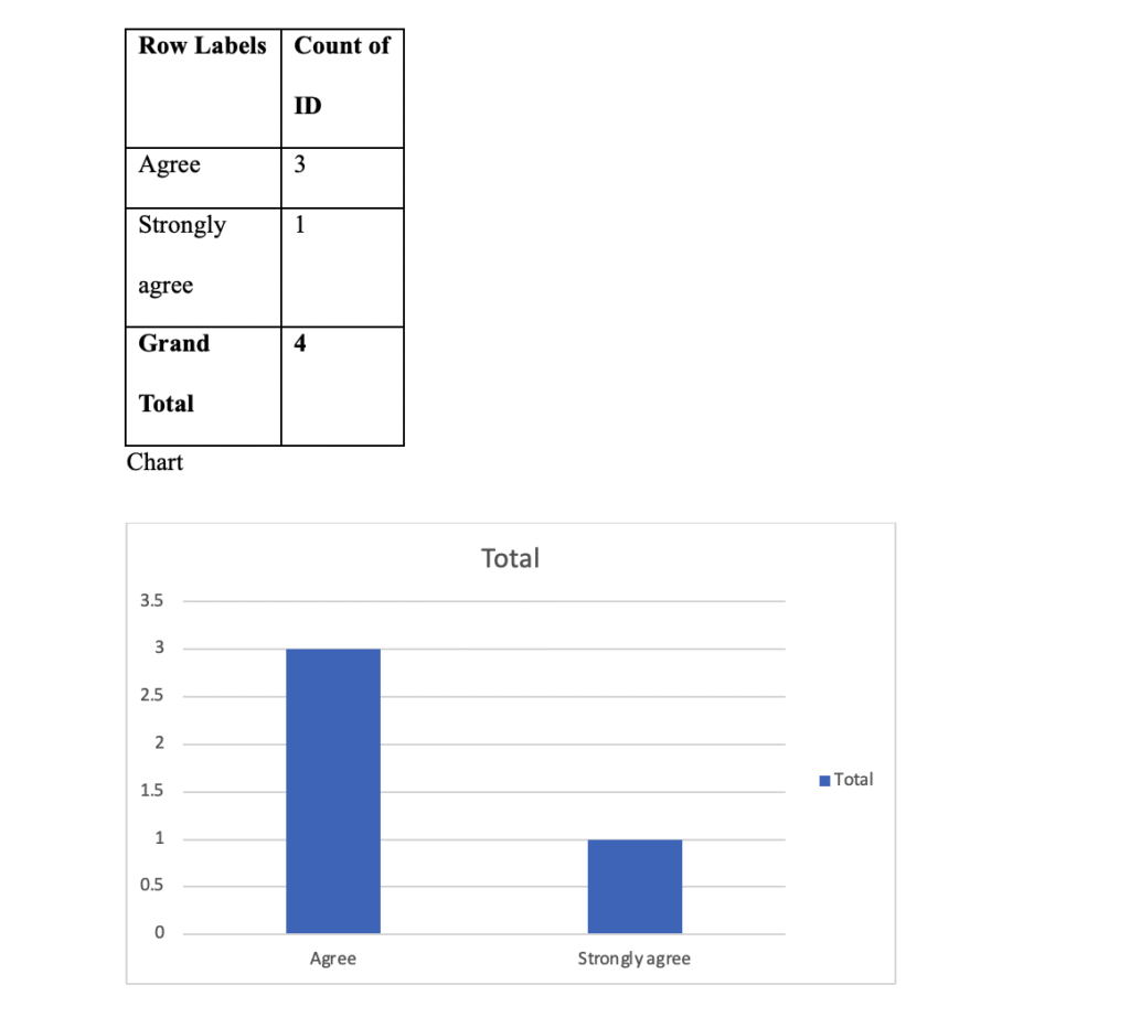 The findings as per the table and the chart shows that 3 participants agreed or strongly agreed that the company addresses retention of top talent well. However, 1 participant responded neutrally (same person as above). This again suggests overall positive feedback, though perhaps room for greater engagement or communication, especially with newer staff.