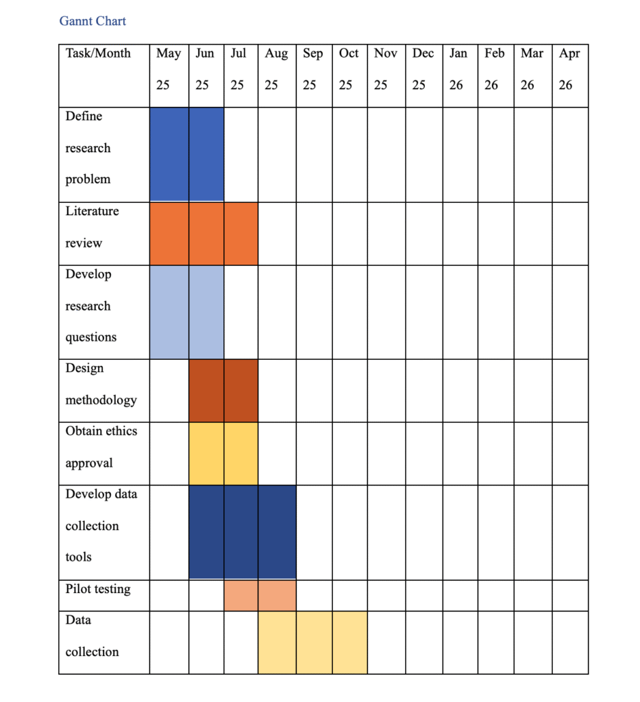 The timeframe for the study is provided in details in the GANTT chart in the appendix section of the paper.