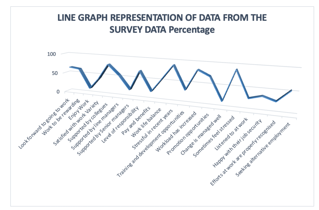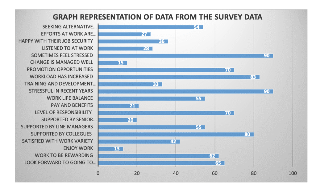 The graph below is a visual representation of the information collected and analysed from the questionnaire. 90% of employees reported high-stress levels in recent years at the workplace. Over 50% of the interviewed participants are actively seeking alternative employment. This means that HR should seek solutions for the workplace’s stress and come up with alternative options for employee retention. The graph is an easy to read tool for data representation and analysis.
