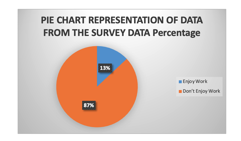 Pie charts are a helpful data representation approach that enables the person analysing the data to categorise information based on the size of a component in relation to the total. Pie-charts are good visual representations that show proportions in relation to the total. For example, based on the data provided above, the chart has allocated the smallest proportion to a blue area where only 13% of respondents said they enjoyed their work. 87% did not enjoy their current work position.